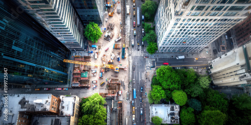 Aerial view of busy construction site in urban environment, showcasing cranes, vehicles, and greenery