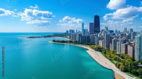 Aerial View of Chicago's Skyline with Turquoise Lake and Clear Blue Sky on Sunny Day