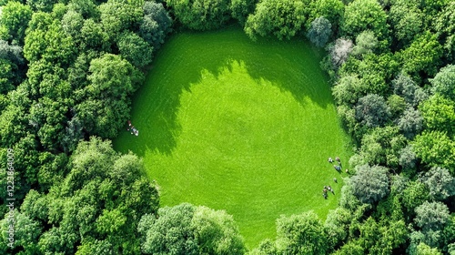 Aerial view of circular park, people relaxing, green trees. Use website background