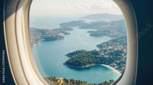 Aerial view of coastal islands and sea from airplane window.