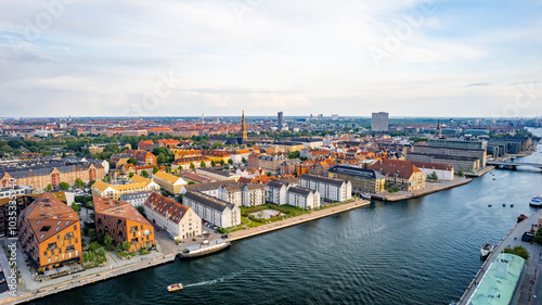 Aerial view of colorful Nyhavn canal with historic buildings and ships in the harbour, Copenhagen, Denmark.