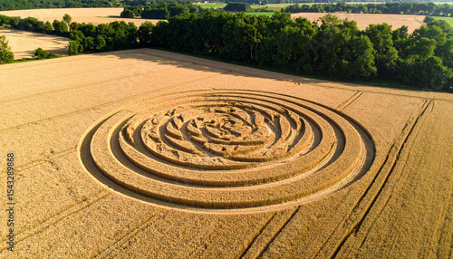 Aerial View of Crop Circle: A mesmerizing crop circle pattern unfolds in a vast golden wheat field, creating a captivating contrast against the surrounding greenery.