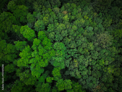 Aerial view of dense, green treetops of a forest, forests in the region around Oldenburg in June, Lower Saxony, Germany