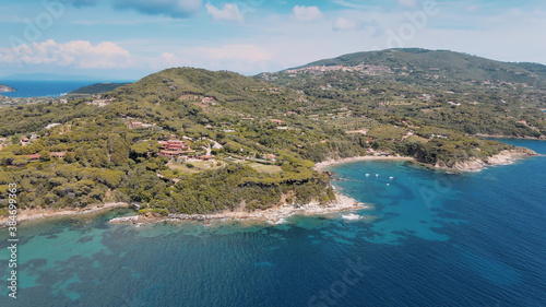 Aerial view of Elba Island. Southern Coastline in summer season. Drone viewpoint. Slow motion.