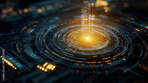 Aerial view of futuristic digital interface with glowing elements, showcasing intricate patterns and vibrant colors. design evokes sense of advanced technology and innovation