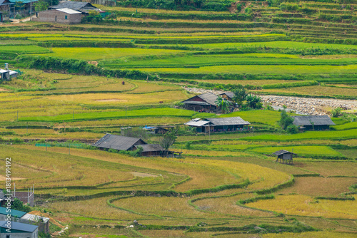 Aerial view of golden rice terraces in Khau Pha pass at Mu Cang Chai town near Sapa city, North of Vietnam. Beautiful terraced rice field in harvest season in Yen Bai province.