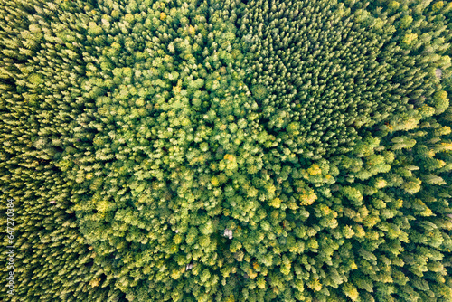 Aerial view of green pine forest with dark spruce trees. Nothern woodland scenery from above