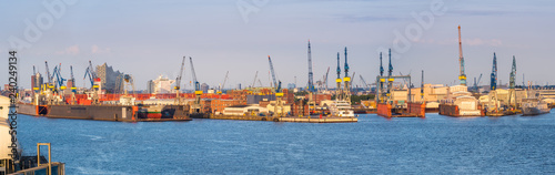 Aerial view of Hamburg Harbor, Germany, with docks and cranes in the evening sun.