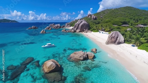 Aerial View of Idyllic Tropical Beach with Clear Turquoise Water and Granite Boulders