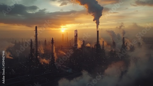 Aerial view of industrial plant at sunset, emitting smoke and pollution into the atmosphere.