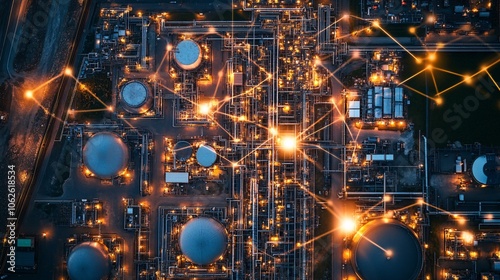 Aerial View of Industrial Refinery Complex with Pipes, Tanks, and Infrastructure - Energy and Manufacturing.
