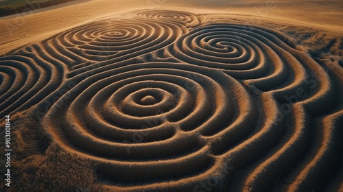 Aerial view of intricate crop circle patterns in a wheat field during sunset, showcasing spiral and circular shapes creating a mesmerizing landscape.