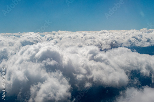 Aerial view of Large, fluffy cumulus clouds outside my airplane window The clouds exhibit a soft, billowy texture and appear dense, typical of cumulus forms.