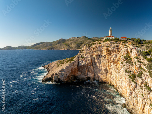 Aerial view of Lastovo island with lighthouse and cliff, Dubrovnik-Neretva, Croatia.