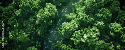 Aerial view of lush dense tropical rainforest with various shades of green foliage, creating a natural and serene landscape scene.