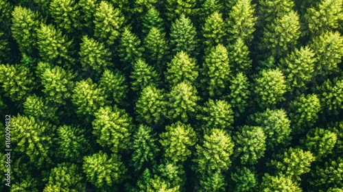 Aerial view of lush green coniferous forest, showing dense treetops.