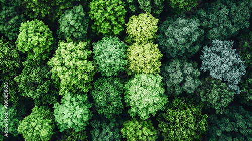Aerial view of lush green forest canopy displaying diverse tree tops and rich foliage. Captures the beauty of nature from above.