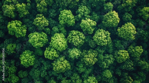 Aerial view of lush green forest canopy showcasing diverse tree tops in vibrant colors