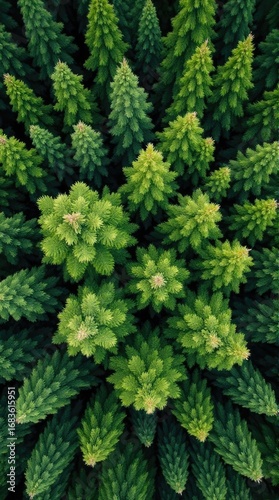 Aerial View of Lush Green Pine Forest Canopy with Varied Light and Shadow