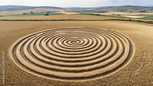 Aerial view of mysterious crop circle pattern in golden wheat field landscape