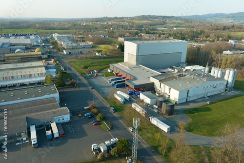 Aerial view of new factory building for producing and shipping of industrial equipment