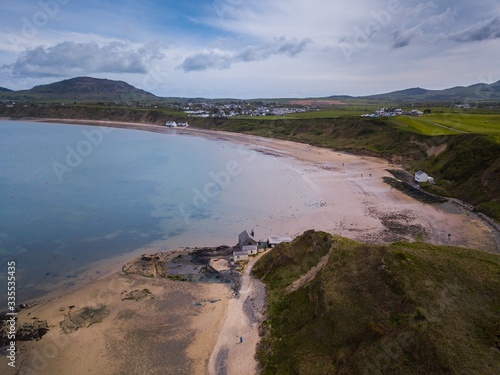 Aerial view of Porthdinllaen village and Yr Eifl Mountains in background, Morfa Nefyn, Llyn Peninsula, Gwynedd, Wales, UK