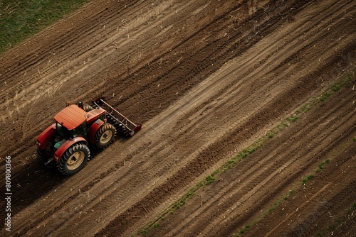 Aerial View of Red Tractor Plowing Brown Fields