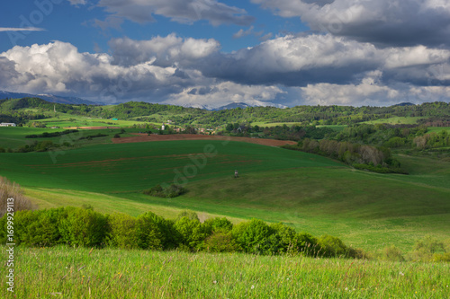 Aerial view of rolling green hills and fields stretching towards the distant mountains under a sky scattered with puffy clouds, Oravce, Banská Bystrica Region, Slovakia.