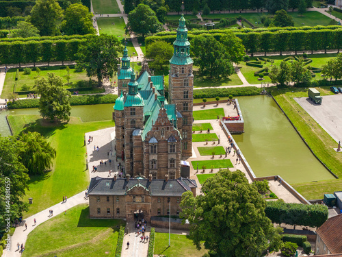 Aerial view of Rosenborg Castle in Copenhagen, Denmark, featuring Renaissance architecture, copper green spires, lush gardens, and a surrounding moat.
