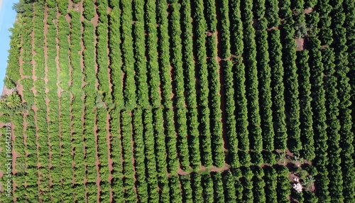 Aerial view of rows of green trees