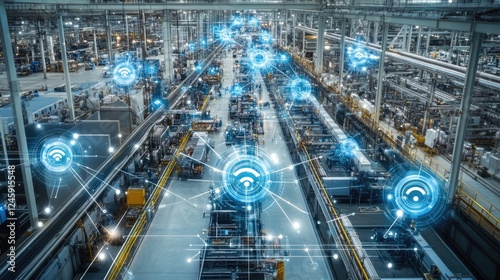 Aerial view of sensor nodes in a manufacturing facility with visual connections indicating the speed and coverage of 5G networks in action.