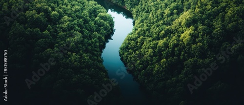 Aerial View of Serene River Winding Through Lush Green Forest in Summer