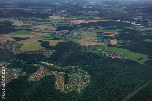 Aerial view of small villages and green forests during summer season in Eastern Europe.