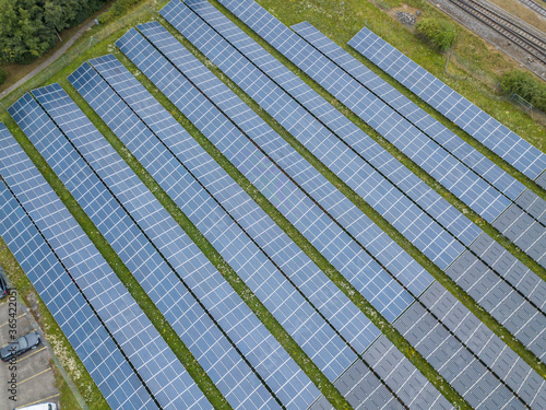 Aerial view of solar panels for photovoltaic power generation on field.