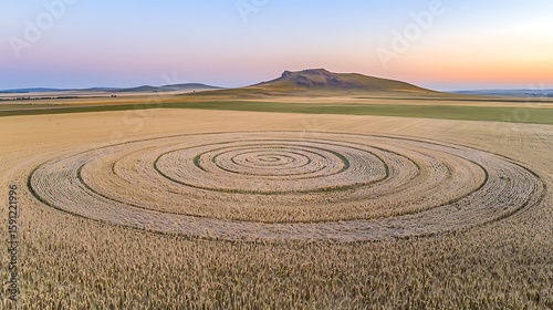 Aerial View of Spiral Crop Circle in Wheat Field at Sunset