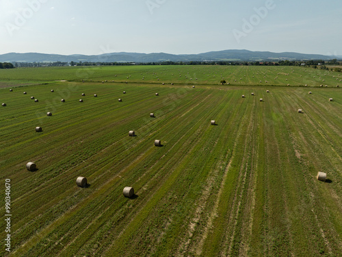 Aerial View of Summer Field Landscape With With Dry Hay Bales During Harvest. Green field in the countryside in summer full of straw bales in the Opole province in Poland.