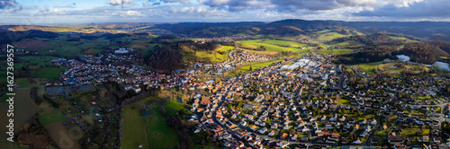 Aerial view of the city Niedernhausen, Fischbachtal in Germany. On an overcast day in Autumn.