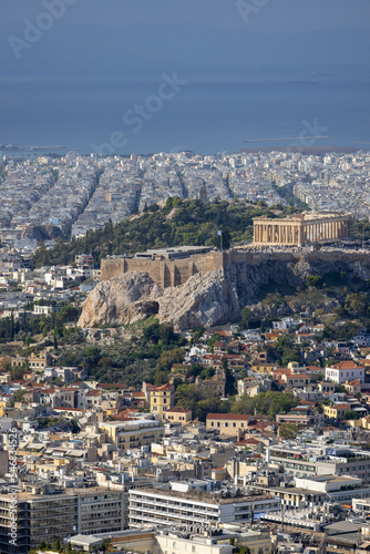 Aerial view of the city with hill of Acropolis of Athens from the Mount Lycabettus, Athens, Greece