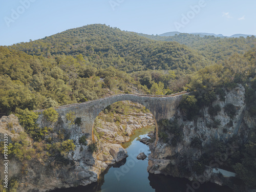 Aerial view of the historic stone Bridge of Llierca over a tranquil river surrounded by serene greenery and mountains, Tortella, Spain.