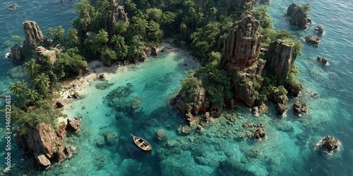Aerial View of Tropical Island with Clear Blue Water and Lush Green Foliage