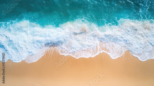 Aerial view of turquoise sea waves gently lapping onto a sandy beach, with ample copy space above the waterline.