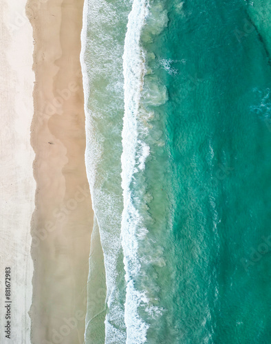 Aerial view of turquoise water and waves crashing onto a sandy beach