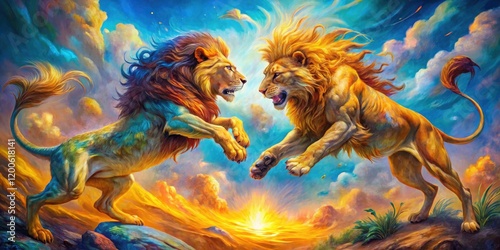 Aerial View of Two Majestic Lions Engaged in a Fierce Battle in a Vibrant Painting, Capturing the Raw Power and Intensity of Nature's Kings in a Stunning Artistic Representation