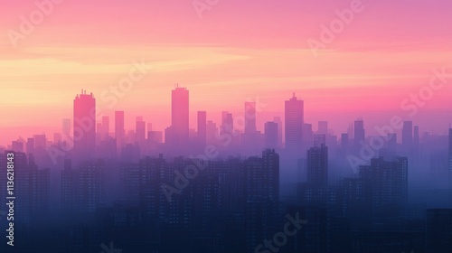 aerial view of urban skyline, silhouettes of high-rise buildings at twilight, soft pastel colors in sky, peaceful and serene atmosphere