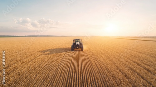 aerial view of vast wheat field with lone tractor moving in perfect lines