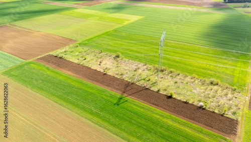 Aerial view of vibrant green fields interspersed with brown patches, showcasing agriculture and land management. The landscape features a power line casting a shadow on the terrain.