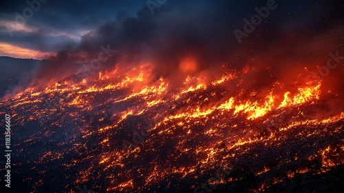 aerial view of wildfire burning in wide area with flame fire and smoke
