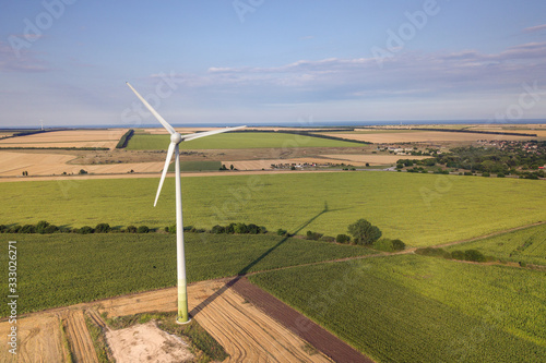 Aerial view of wind turbine generators in field producing clean ecological electricity.