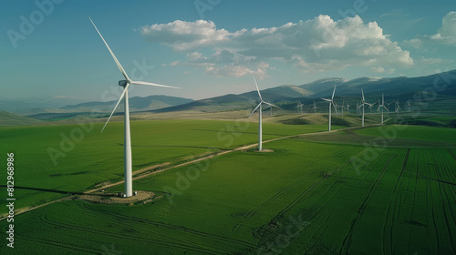 Aerial view of wind turbines amidst verdant fields under a clear sky, symbolizing sustainable energy