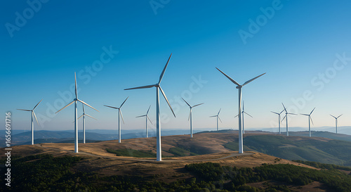Aerial view of wind turbines generating clean energy on a sunny hilltop.